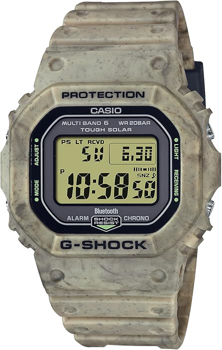 The unique dual-color molding technique used for the bezel and band of the GW-B5600SL creates a texture reminiscent of sand and earth. With a striking combination of brown hues, this model is more than just a watch—it's an expression of natural beauty. This attention to detail reflects Japan’s dedication to craftsmanship, merging function with artistic inspiration.