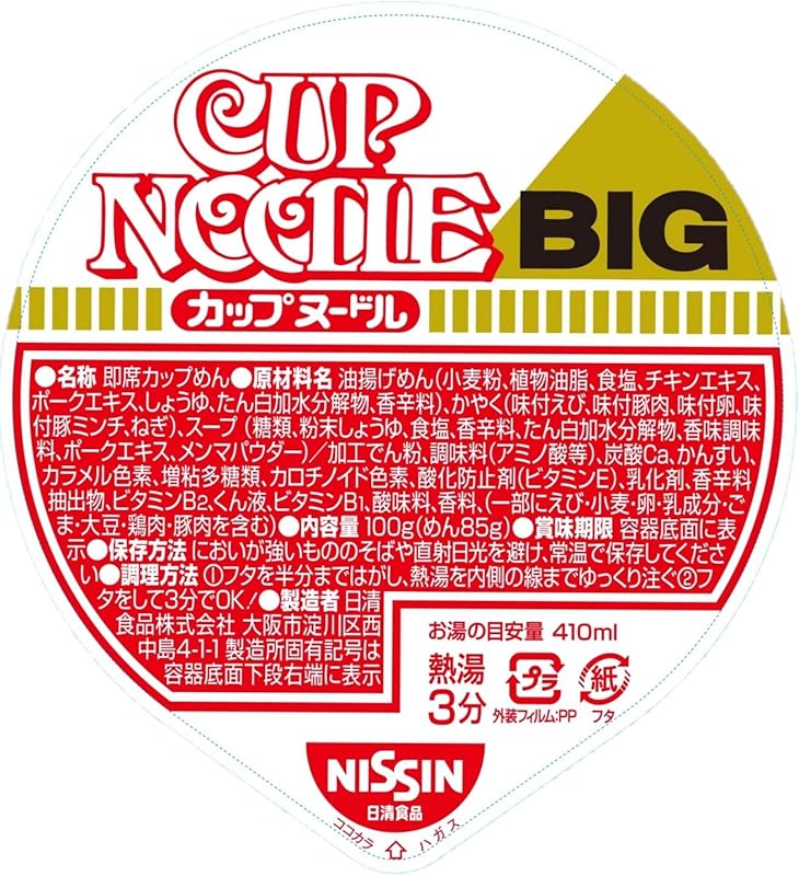 - Cup Noodles Big (101g x 12 cups) - A classic comprised of a savory soy sauce base, featuring tender minced pork, succulent shrimp, and our signature "mystery meat," ensuring a hearty and filling meal.